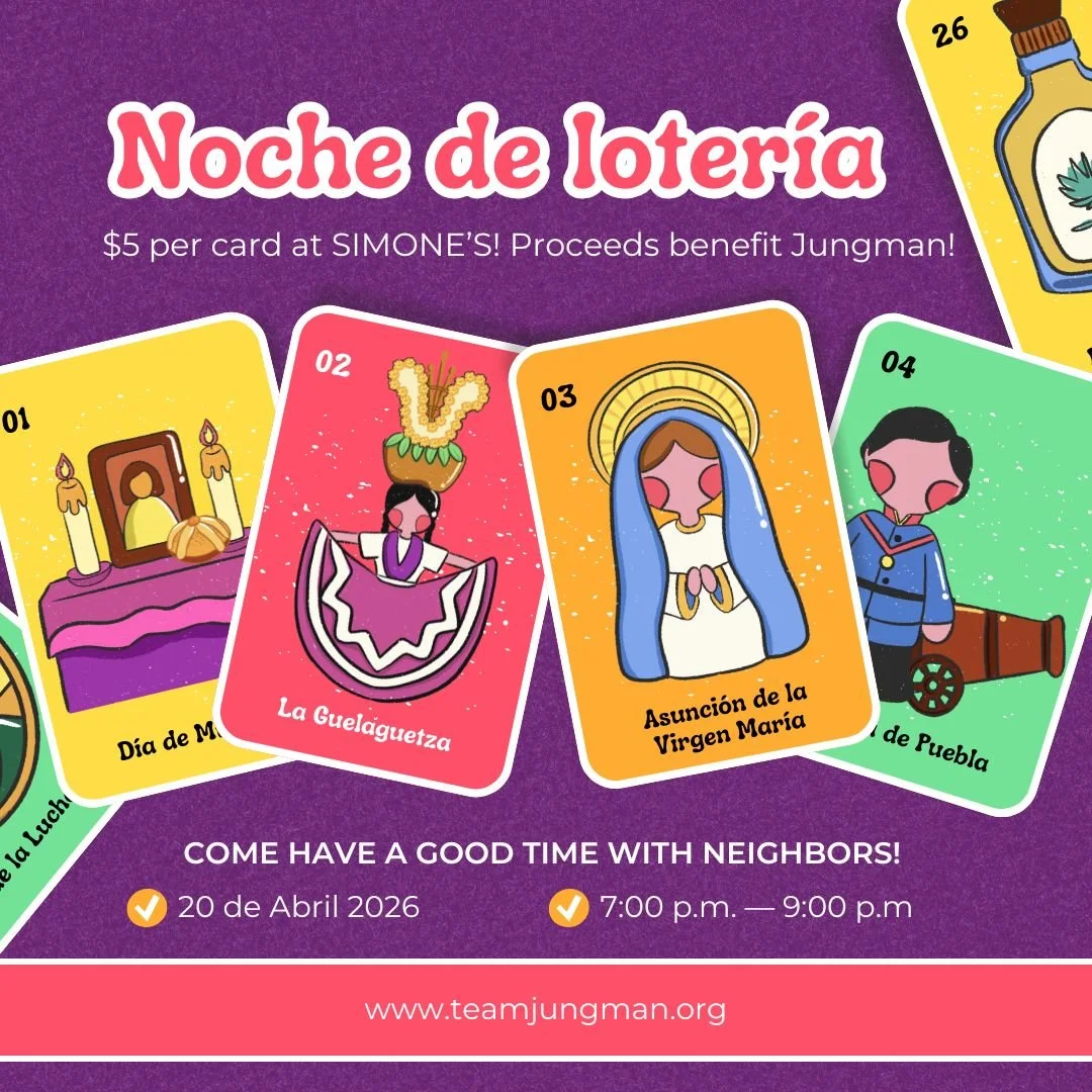Feeling lucky? Come play to Loteria Night at Simone’s bar and grill. The games go from 5pm to 9pm and proceeds benefit our school! This is sure to be a fun night with neighbors and school friends. And everyone is a winner because it benefits Jungman STEM Magnet School.